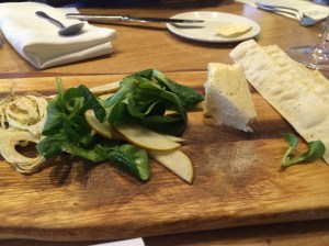Le Conquerant cow’s milk white mould cheese (Normandy, France) lavosh, pear and mache salad; Bress Wine, Cider and Produce New Release Wine Lunch 2014 – Plough Hotel, Footscray